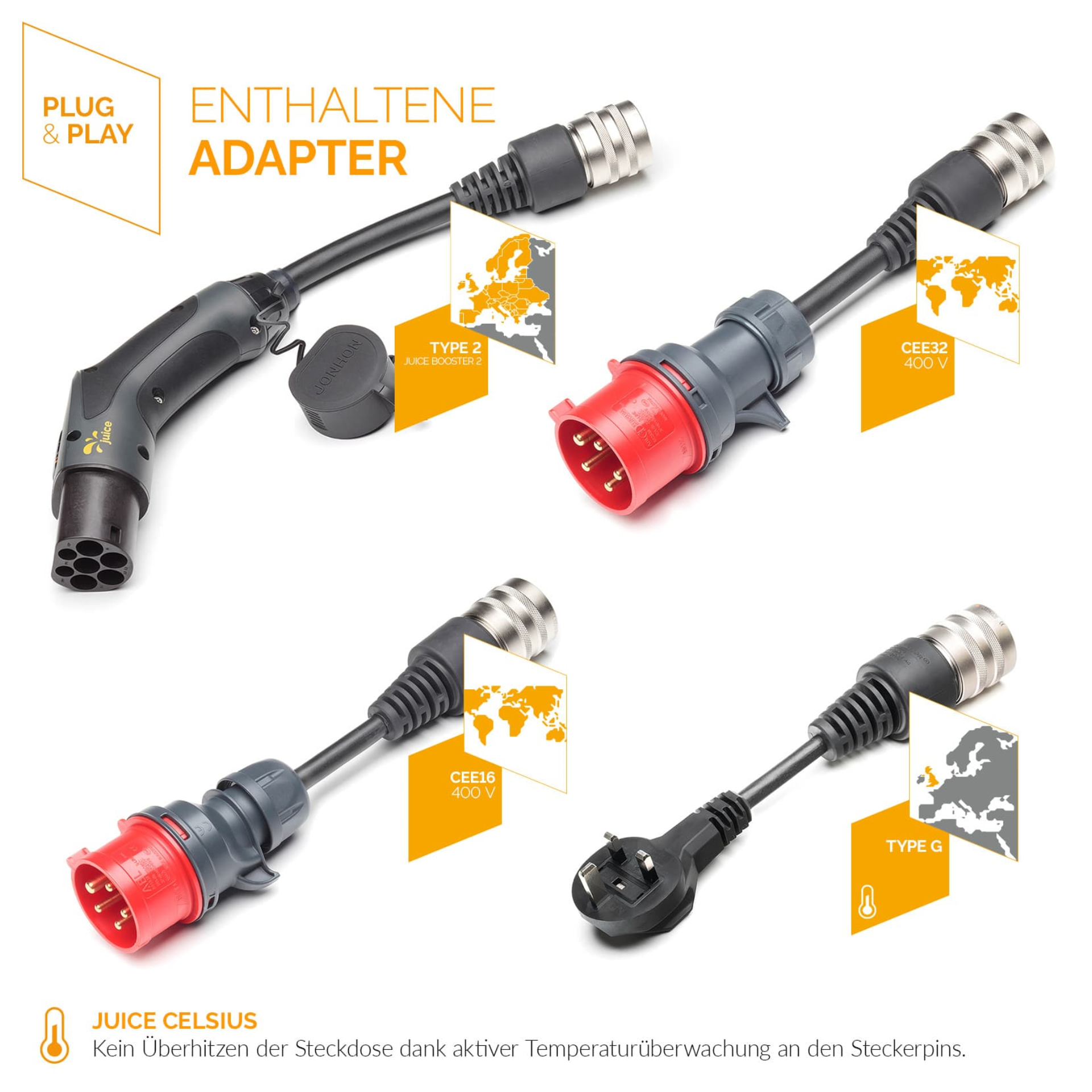 • Set inkl. 4 Adapter: Typ 2, 400 V, CEE32 400 V, CEE16 400 V, Typ G (UK) 230V