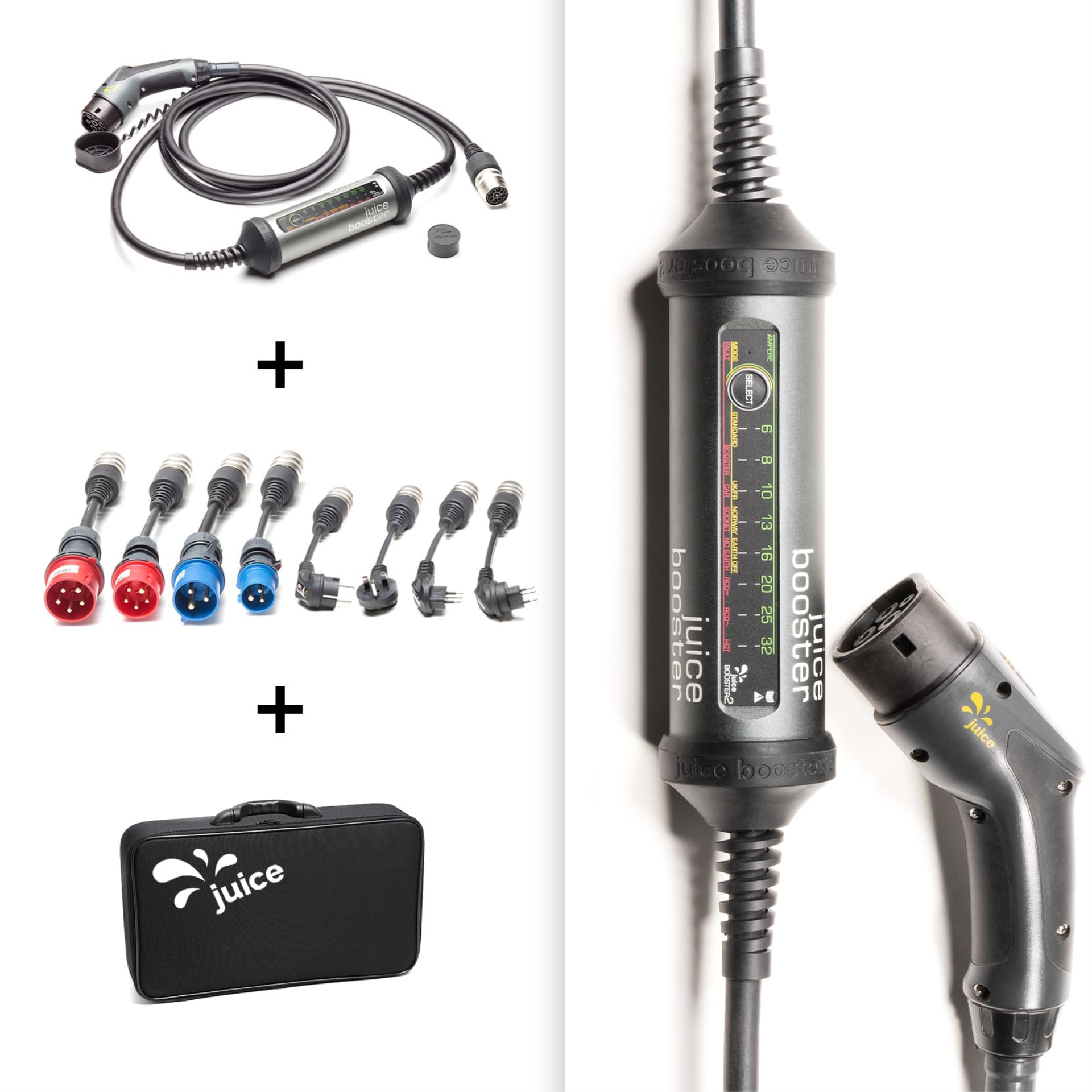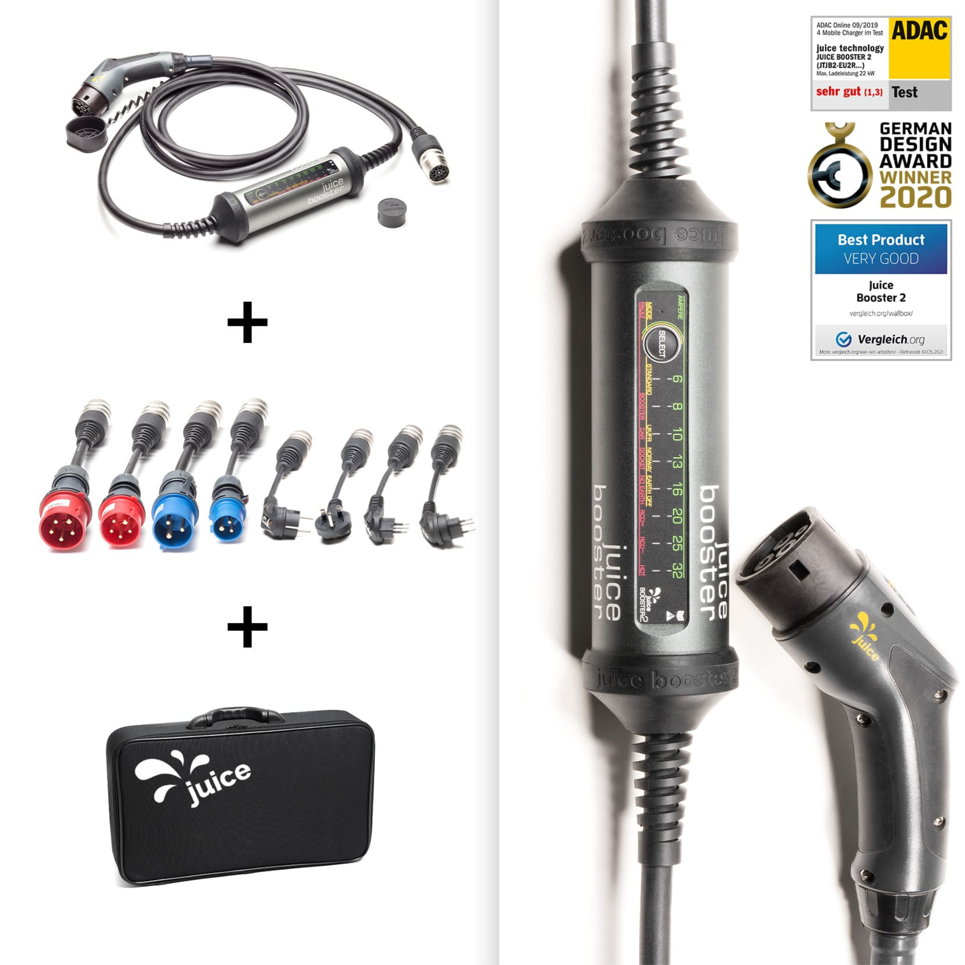 Der JUICE BOOSTER 2 ist eine besonders vielseitig einsetzbare Ladelösung für Elektroautos oder Motorräder mit Typ-2-Ladeanschluss. Er ist einsetzbar als Wallbox, als Typ-2-Kabel für öffentliche Ladesäulen oder als mobile Lademöglichkeit (3-in-1). Mit seiner Ausgangsleistung von bis zu 22 kW laden Sie Ihr E-Fahrzeug immer schnellstmöglich auf – und das an praktisch jeder Steckdose weltweit. Dank speziell entwickelter Anschlussadapter und der umfangreichen Sicherheitsausstattung ist eine Fehlbedienung ausgeschlossen. Zudem ist das Kabel besonders robust, zugleich jedoch leicht und kompakt.