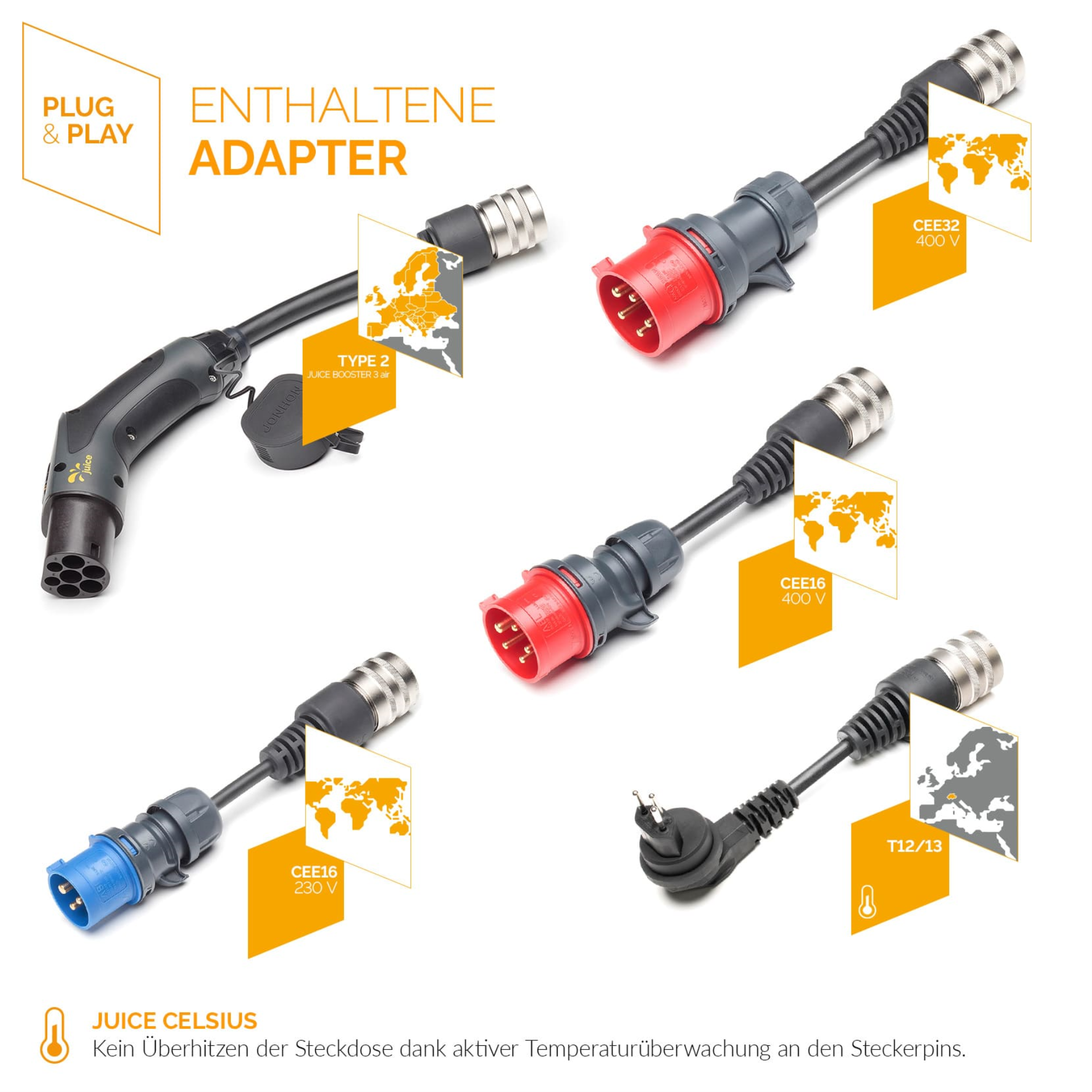 Der JUICE BOOSTER 3 air ist eine vielseitige Ladelösung für Elektrofahrzeuge mit Typ-2-Ladeanschluss. Dank App-Anbindung, Freischaltung per RFID, integriertem Lastmanagement und Logbuch inkl. Belegfunktion ist der JUICE BOOSTER 3 air nicht nur ausgesprochen multifunktional und flexibel, sondern auch intelligent. Mit einer Ausgangsleistung von bis zu 11 kW lädt das E-Fahrzeug immer maximal sicher, schnellstmöglich und völlig unkompliziert an praktisch jeder herkömmlichen Haushalts- oder Industriesteckdose weltweit. Dank speziell entwickelter Anschlussadapter und der umfangreichen Sicherheitsausstattung ist eine Fehlbedienung ausgeschlossen.