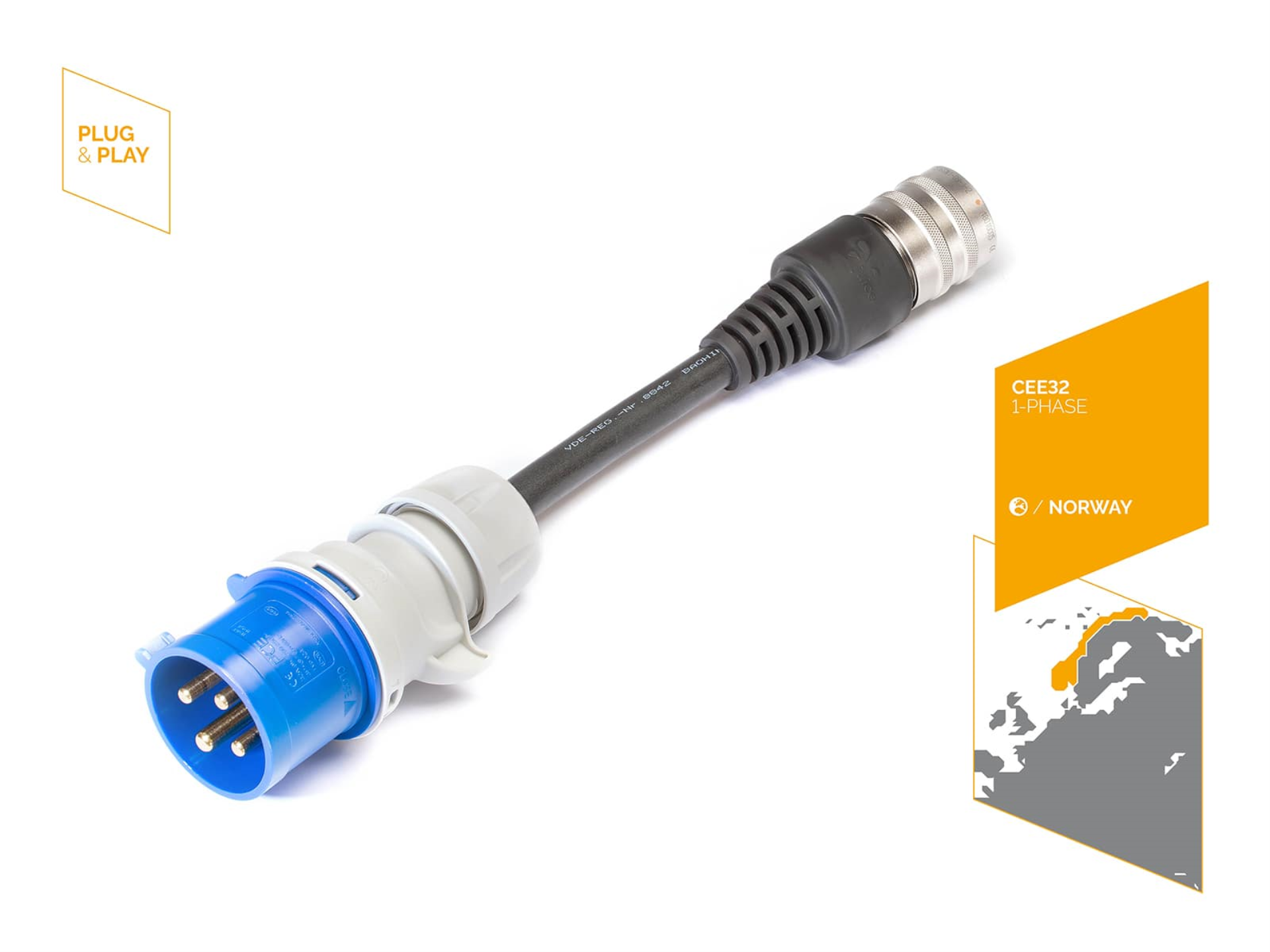 Mit dem JUICE BOOSTER (2, 2 PRO oder 3 air) und dem Sicherheitsadapter JUICE CONNECTOR CEE32 (230V, 1-phasig, 4-polig, blau - Sonderformat: Norwegen NO) können Sie Ihr Fahrzeug an jeder blauen CEE32-Steckdose (norwegischer Campingstecker) in Norwegen aufladen.