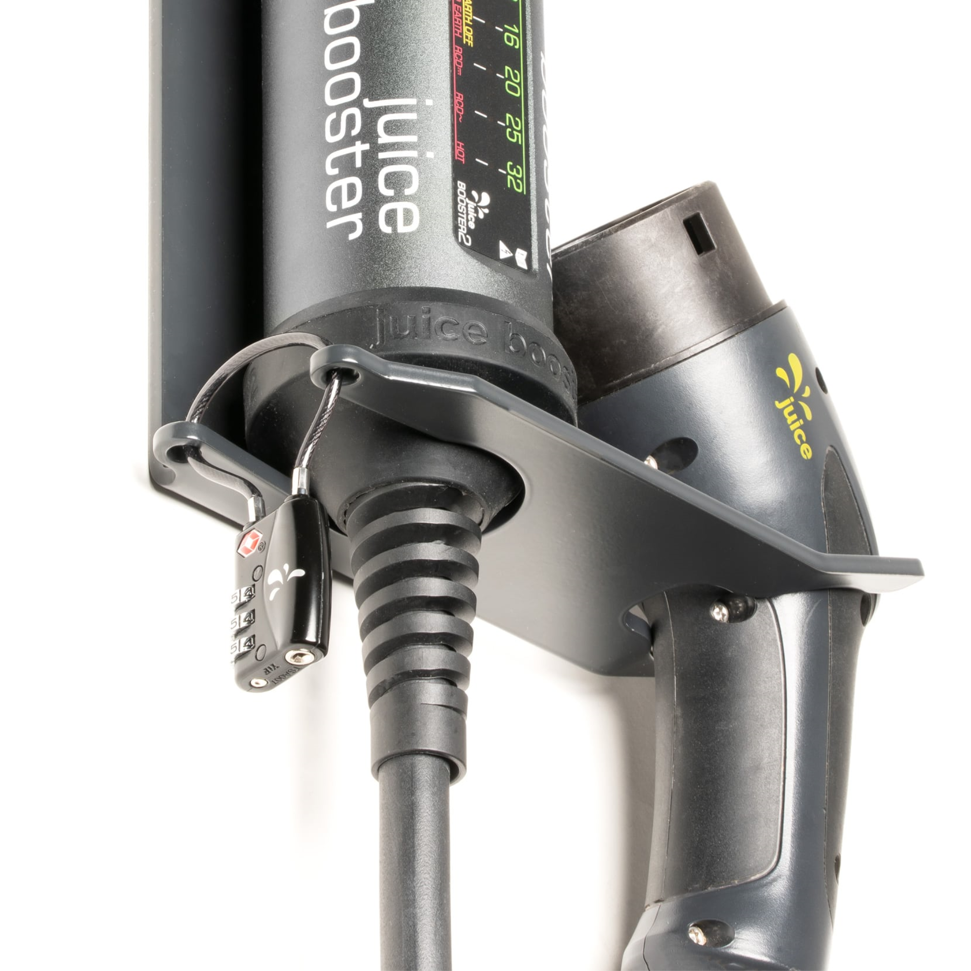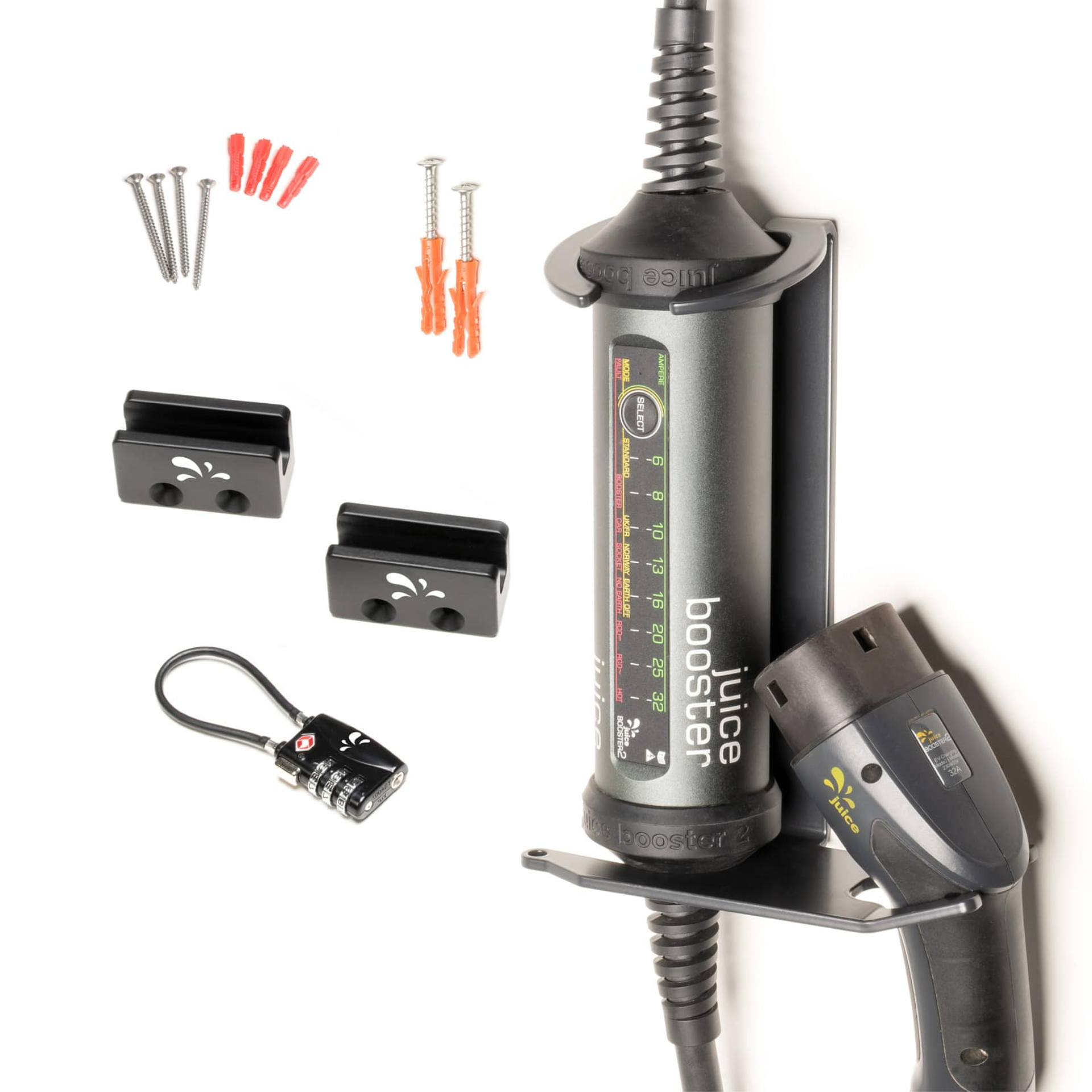 Mit dieser abschliessbaren Wandhalterung wird die mobile Ladestation JUICE BOOSTER 2 zu einer vollwertigen Wandladestation. Der JUICE BOOSTER 2 lässt sich mit einem Handgriff einhängen und für den Gebrauch unterwegs ebenso einfach wieder abnehmen. Während in Privatgaragen die Variante ohne Verriegelung bevorzugt wird, setzen E-Automobilisten in öffentlichen Parkgaragen eher auf die verschliessbare Variante. Damit ist das Gerät wirksam gegen Diebstahl gesichert. Zweimal den Bohrer ansetzen, festschrauben – und fertig.